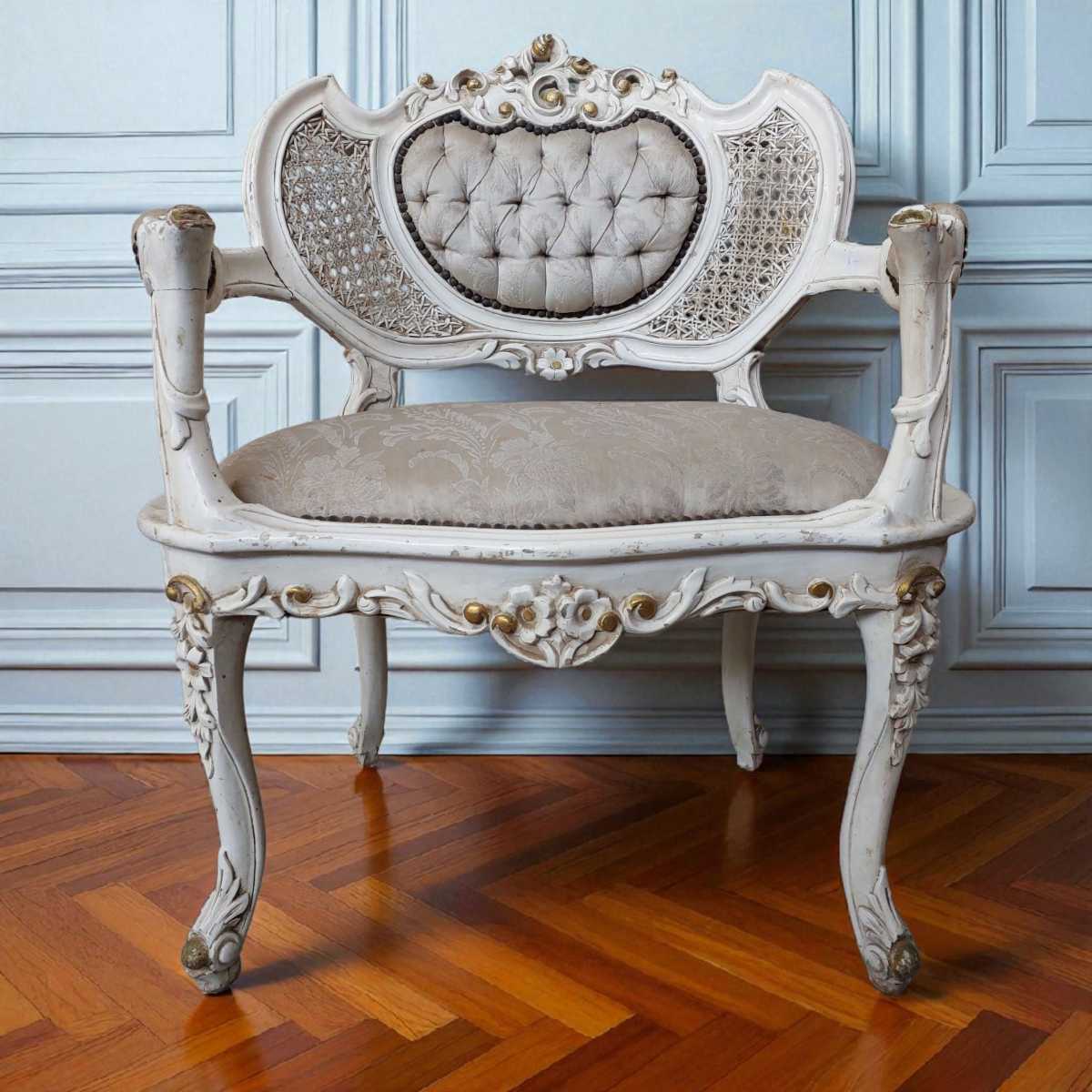 This Antique Italian Armchair retains its original condition, showcasing exquisite craftsmanship. The chair is made of solid wood and features elegant carved details, making it a timeless and durable addition to any space. The use of cane work adds a touch of sophistication and elegance.