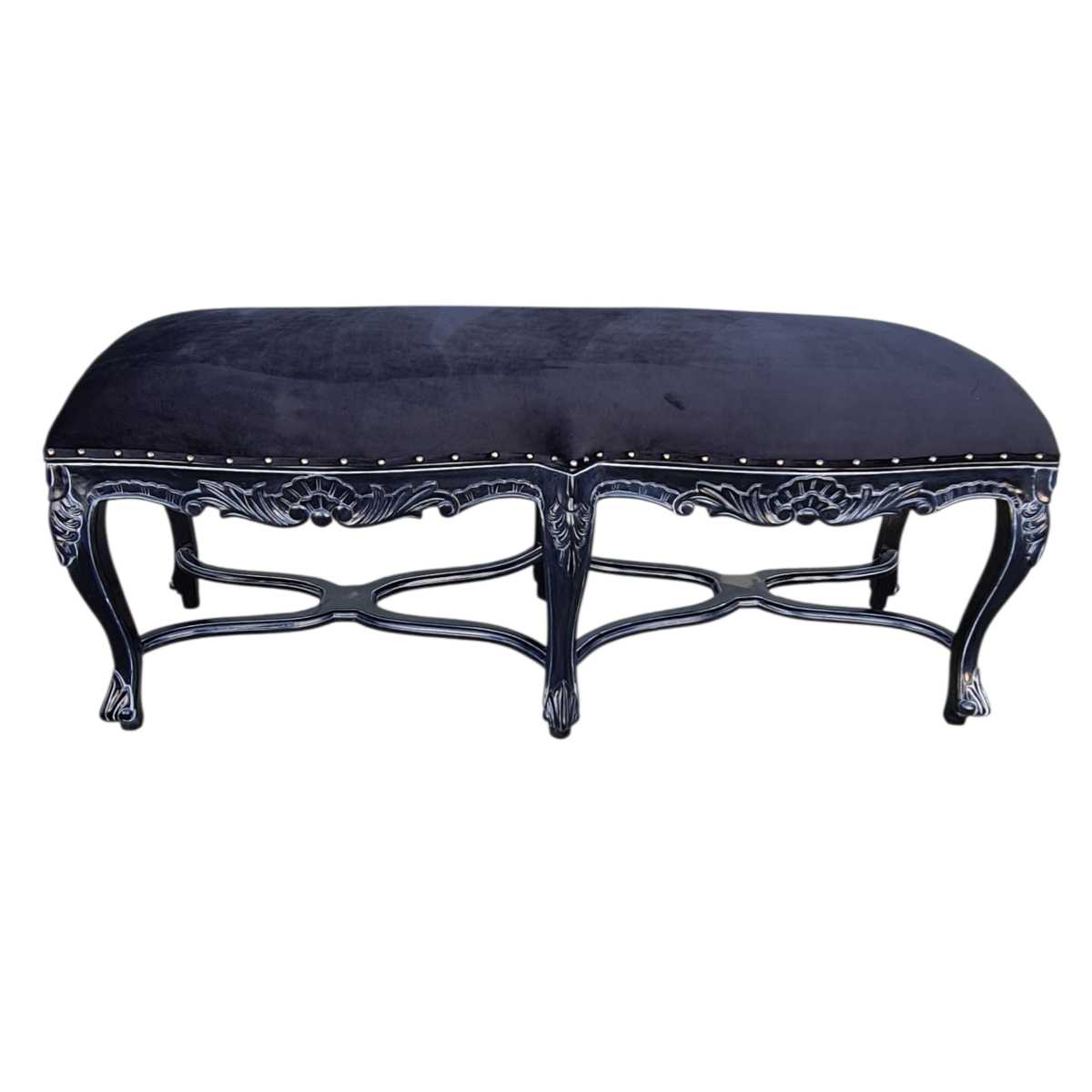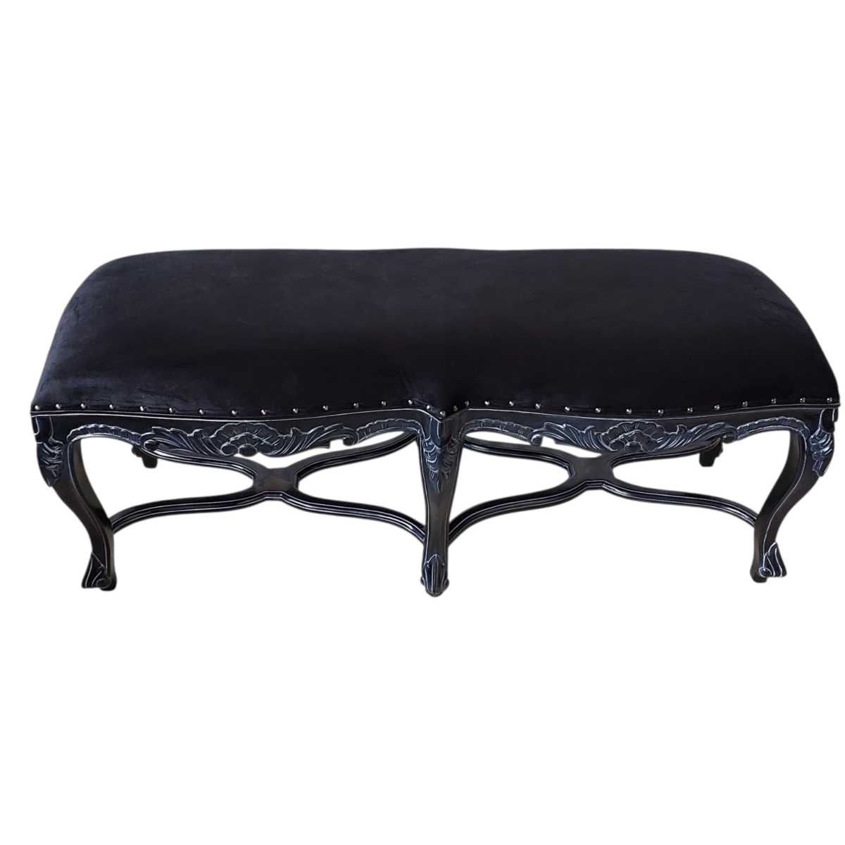 Elevate your bedroom or hallway with the Chalsea French Cross Frame Stool. Hand carved from solid Mahogany wood, this stool exudes classic, expertly-crafted charm. Its high density foam and grey fabric upholstery provide comfort and durability. Great for seating at the end of your bed.