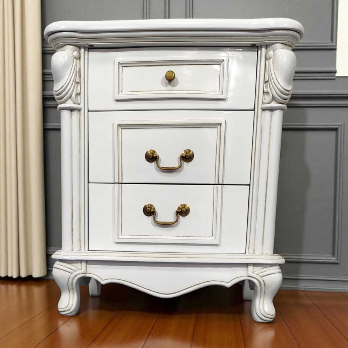 Enhance your bedroom with the DIEU MAHOGANY WOOD NIGHTSTAND ☆ WHITE ANTIQUE. Handcrafted with solid mahogany wood and premium materials, this 3-drawer nightstand features solid joint construction and beautifully crafted panels. The elegant curves and brass hardware add a touch of luxury to any bedroom. Expert craftsmanship at its finest.