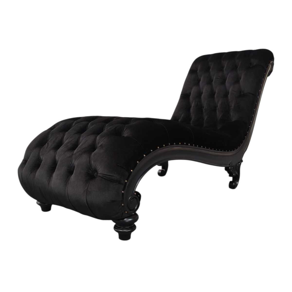 Morsana Chaise, a premium quality hand carved and fully buttoned luxury furniture piece. Made from hand carved Mahogany wood, this chaise features a unique curved design and rare Georgian-style back feet. Upholstered in high density foam and black velvet, with brass studs for added opulence.