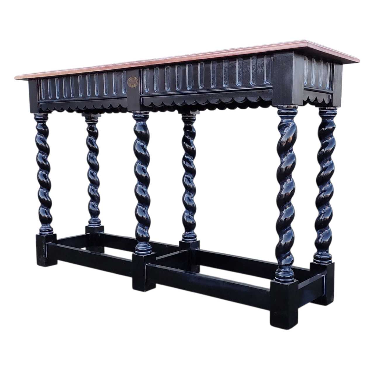 Introduce elegance into your home with ROYALTON MAHOGANY WOOD CONSOLE TABLE. Hand carved from solid Mahogany wood, it features twisted legs and expertly crafted joints for durable quality. A stunning Black base and Natural Washed top complete this finest quality furniture piece.