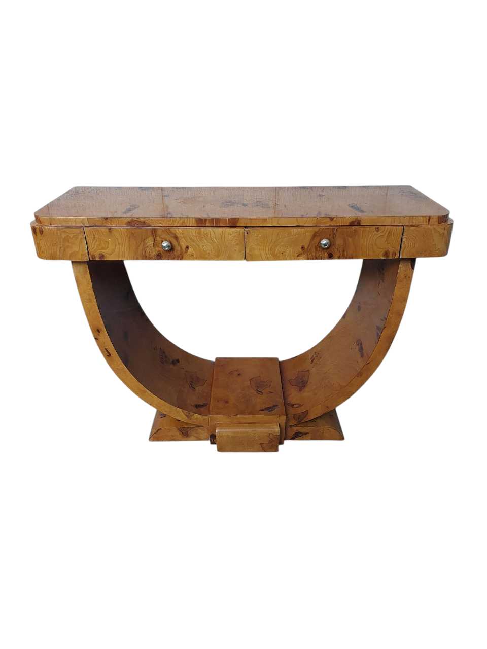 Elevate your living space with the Tampa Bay Art Deco Burl walnut console table. With two drawers adorned with chrome knobs, this European Beech wood masterpiece is both stylish and solidly built. Its unique burl veneer finish adds a touch of elegance to any hallway or living room. Handcrafted with precision and attention to detail, this curved art deco console table is a true work of fine craftsmanship.
