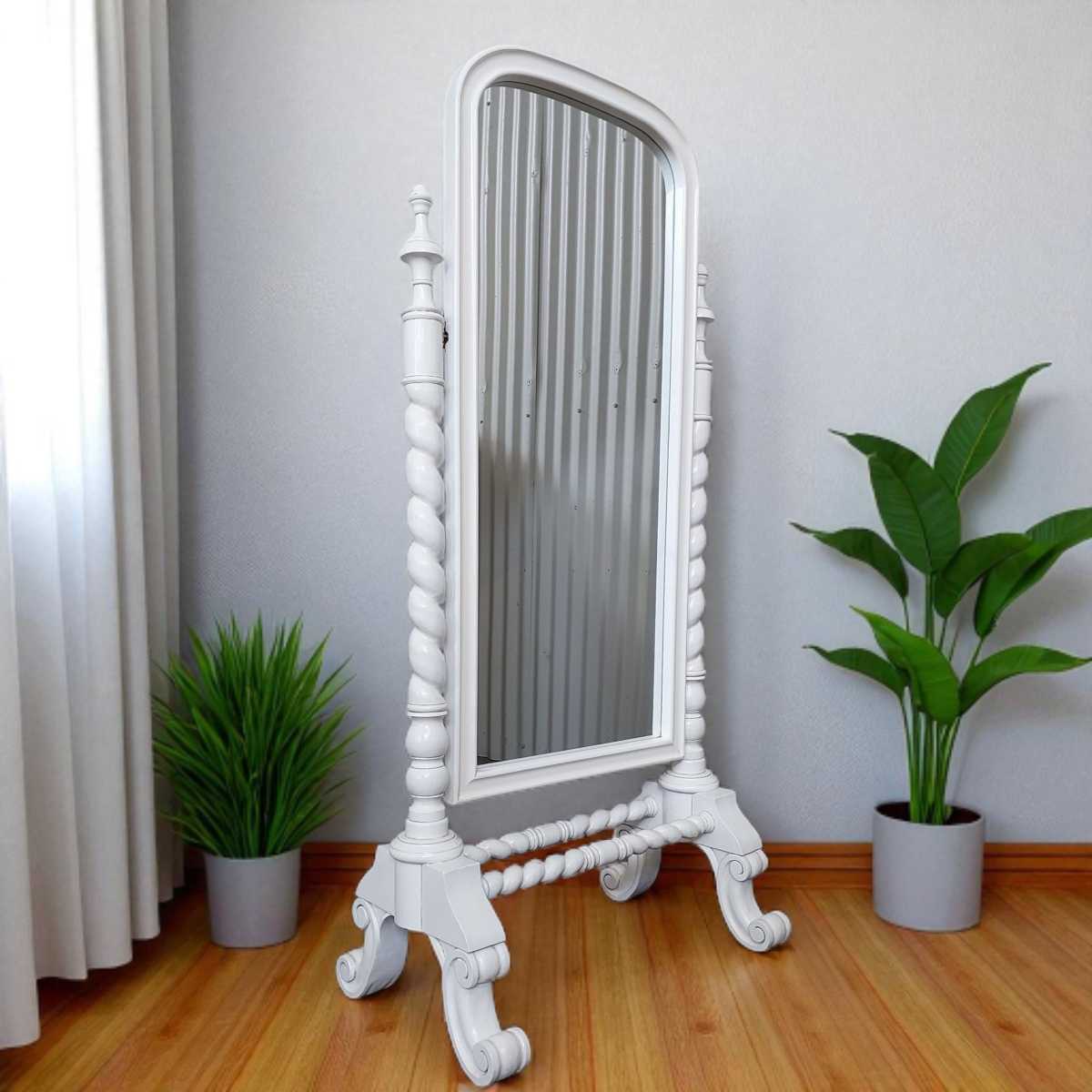 Expertly hand-carved from solid mahogany wood, the Valentina French Cheval Mirror boasts luxurious quality and a stunning white antique finish. With premium materials such as brass and painted mahogany wood, this mirror exudes elegance and sophistication. Upgrade your space with this timeless piece.