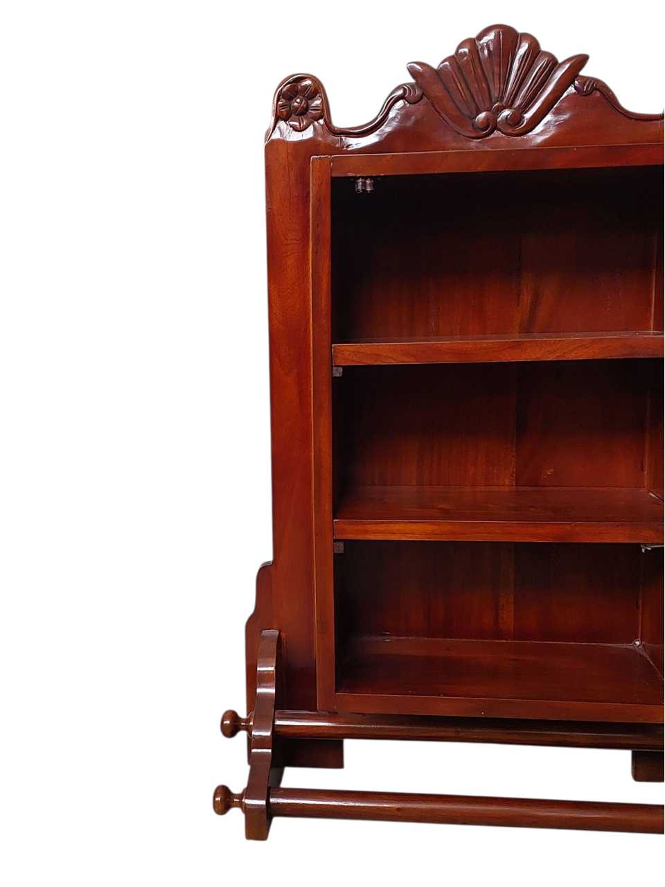 Expertly hand-crafted from premium mahogany wood, this wall-mounted bathroom cabinet exudes classic Victorian style. Meticulously constructed with solid joints and fully assembled, this cabinet showcases the best craftsmanship and traditional tools used by our skilled artisans. Complete with towel rails and a glass glazed door, this timeless piece is made with only the finest materials. Carving work on top of cabinet. Two Fixed shelves inside. Curves' lines & Plain edges are symbols of excellent craftsmanship.